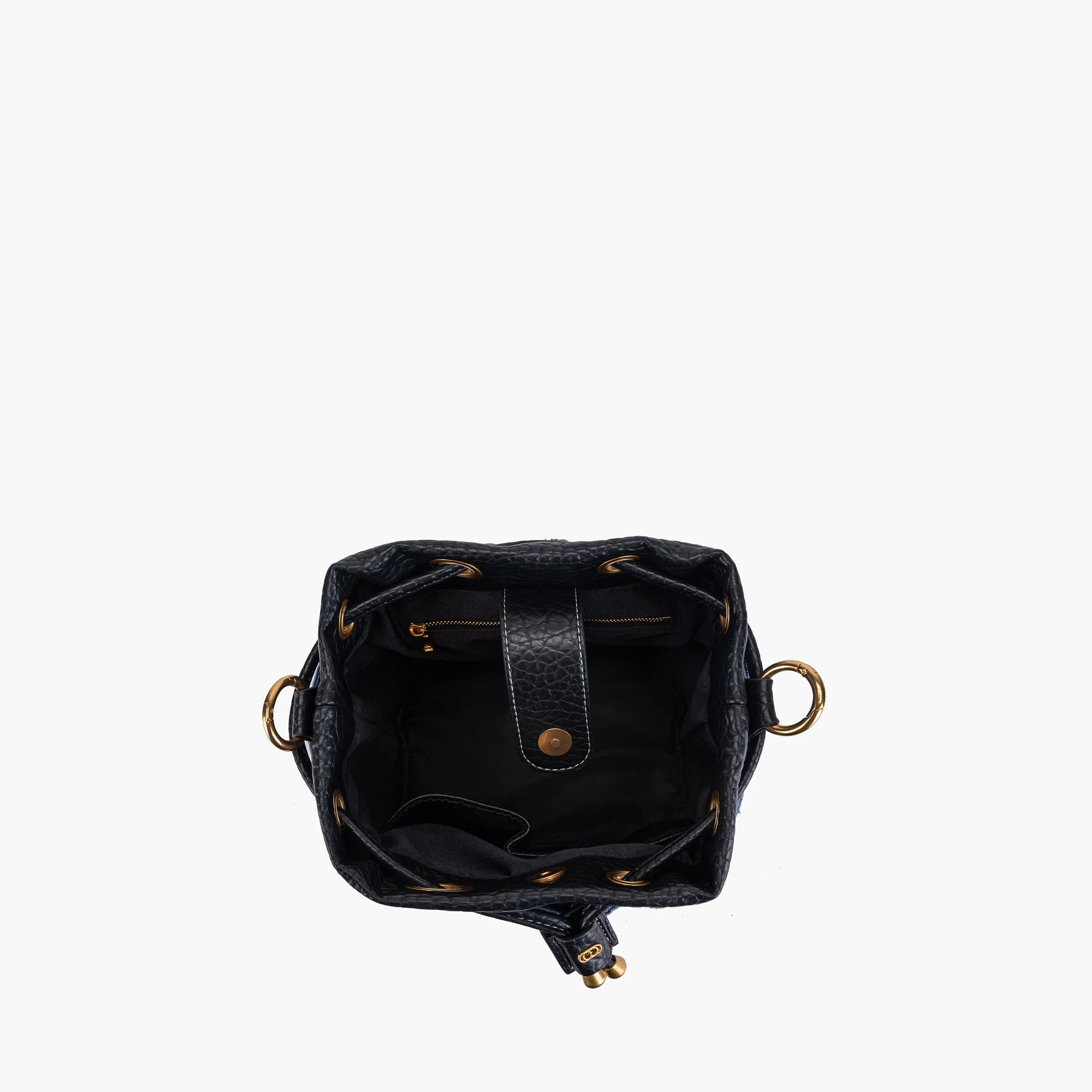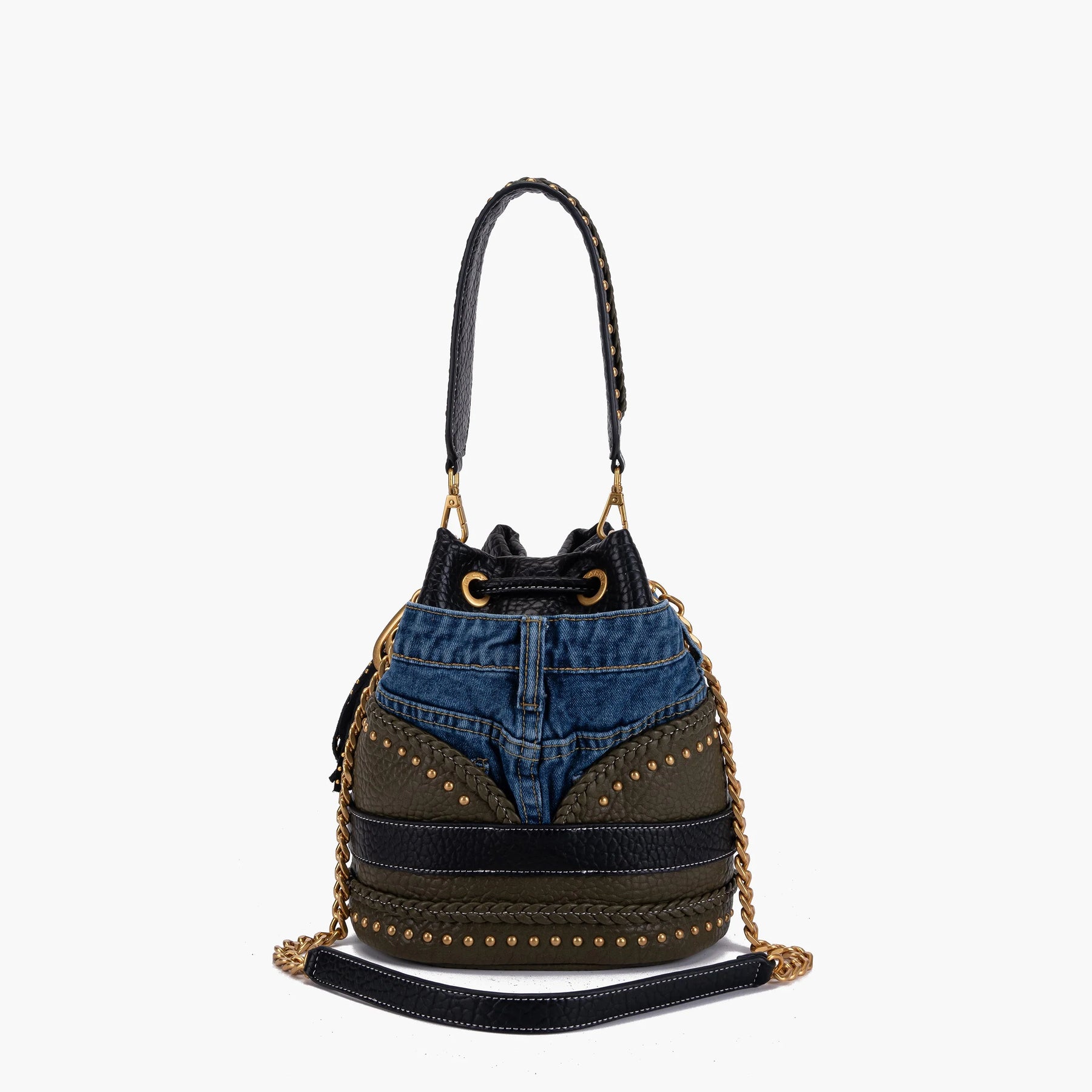 Secchiello multi materiale in jeans ed ecopelle martellata, con borchie dorate e manico e tracolla rimovibile