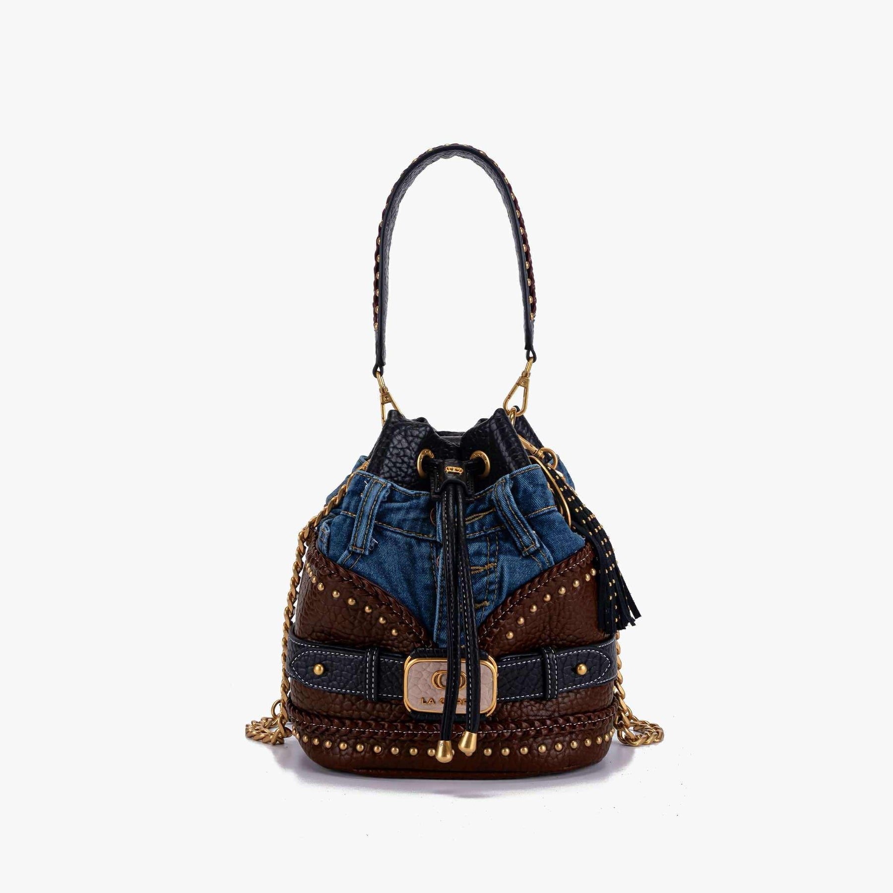 Secchiello multi materiale in jeans ed ecopelle martellata, con borchie dorate e manico e tracolla rimovibile