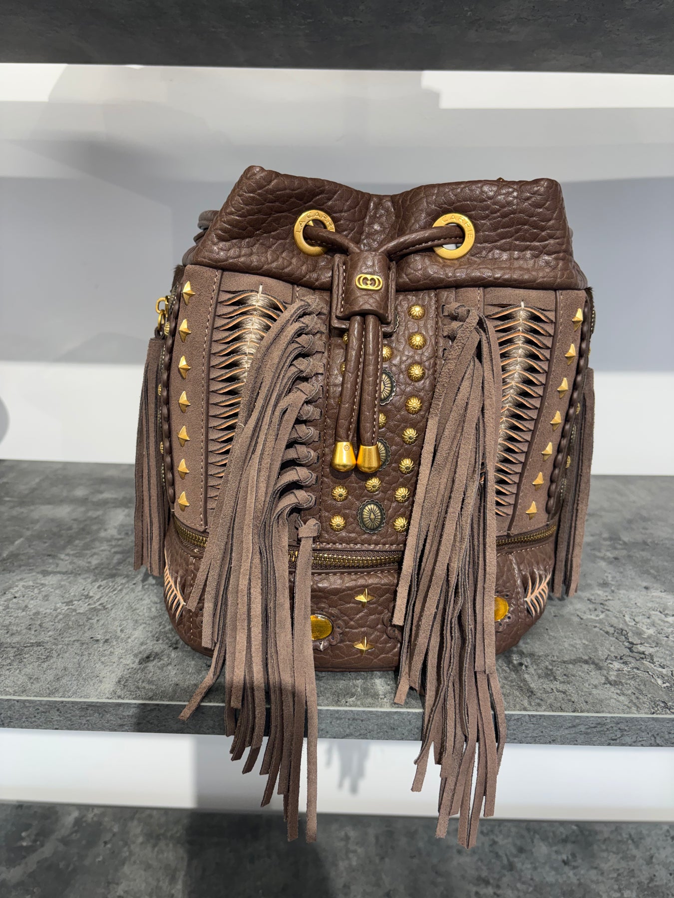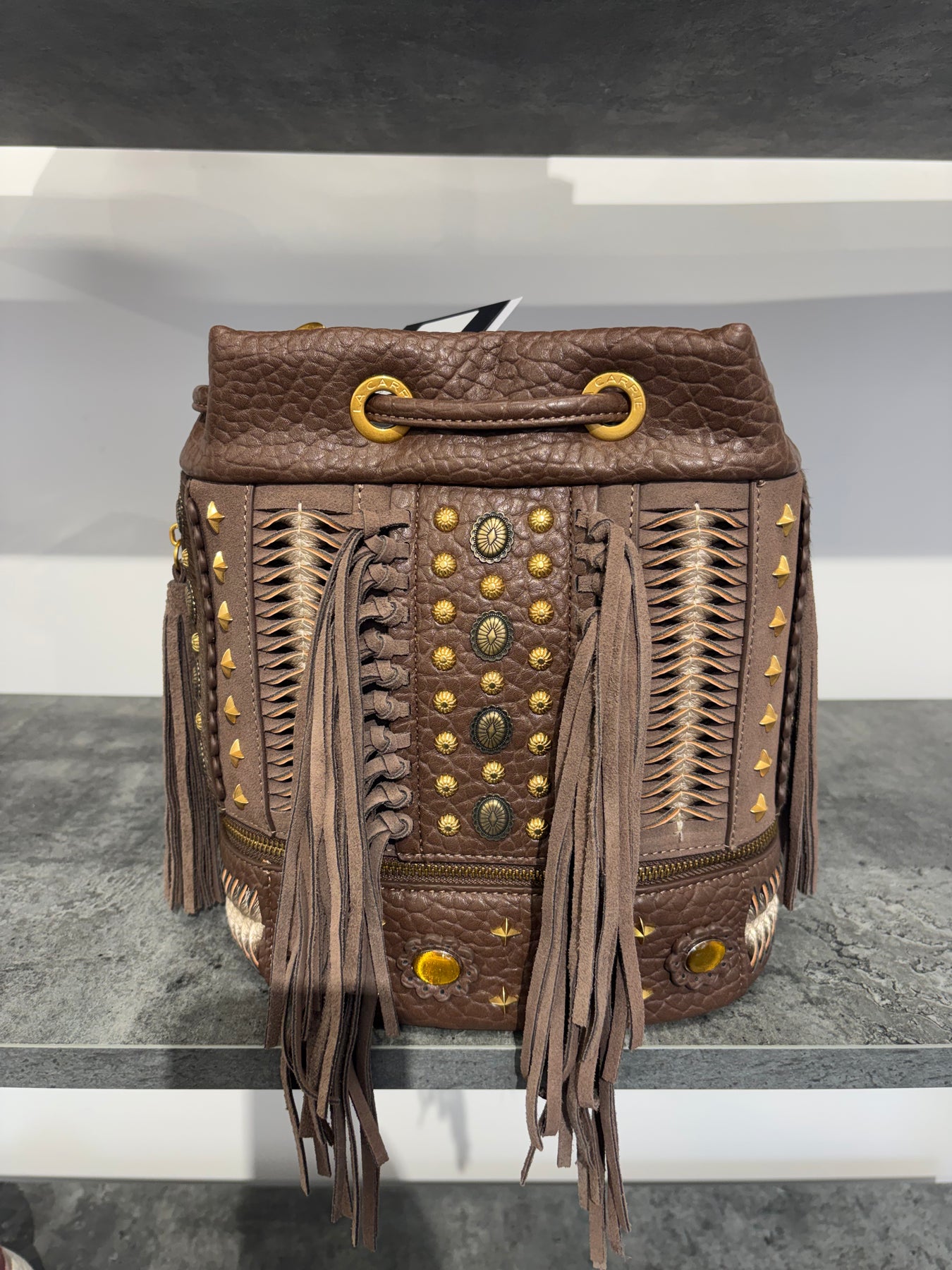 Secchiello in ecopelle effetto martellato con borchie in oro , tracolla catena e manico rimovibile