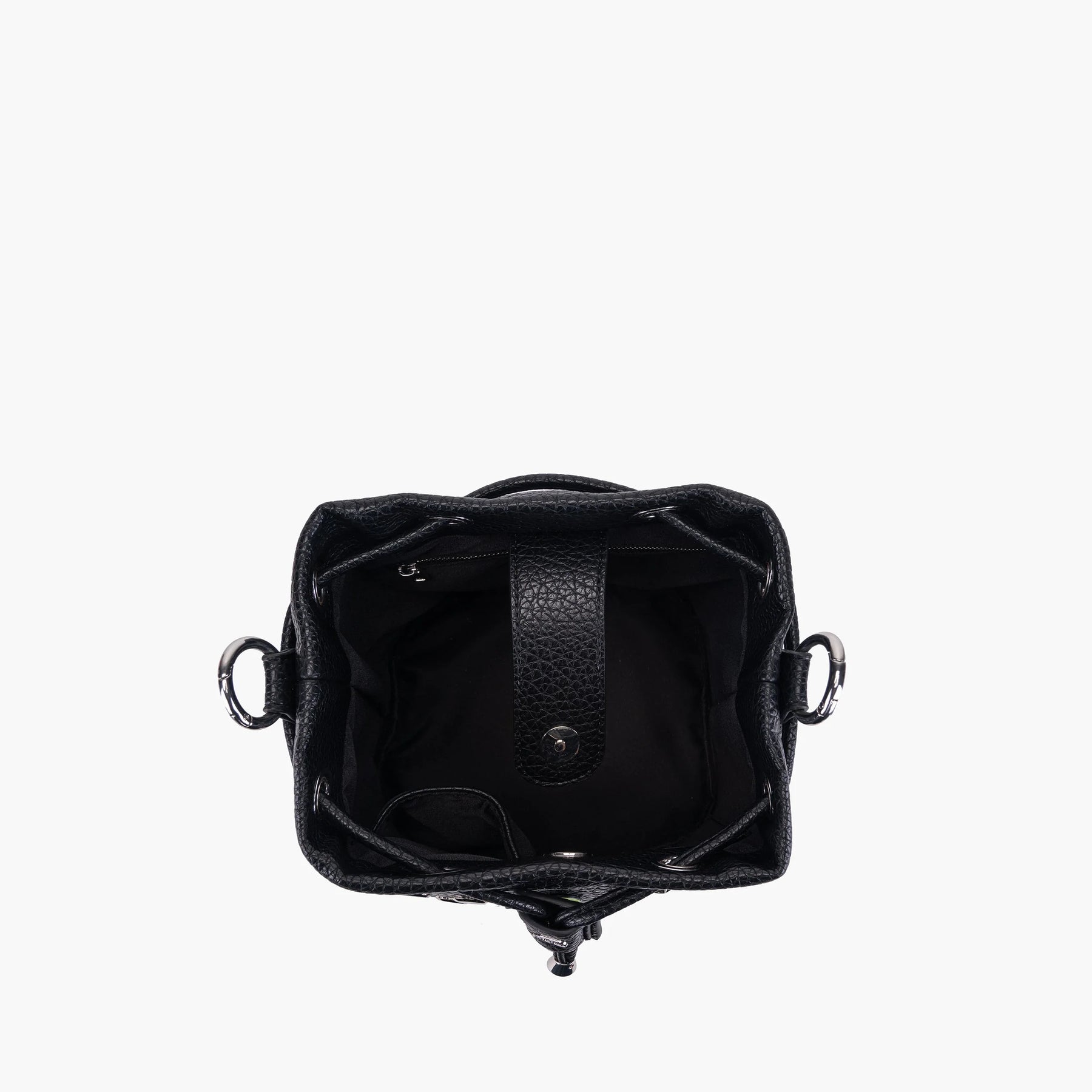 Secchiello in ecopelle martellata con spille colorate applicate, manico e tracolla rimovibili