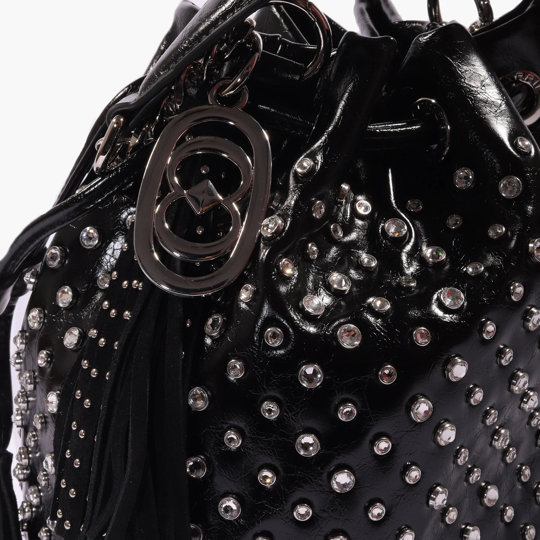 Secchiello in ecopelle effetto lucido con strass applicati su tutta la borsa, tracolla e manico rimovibili