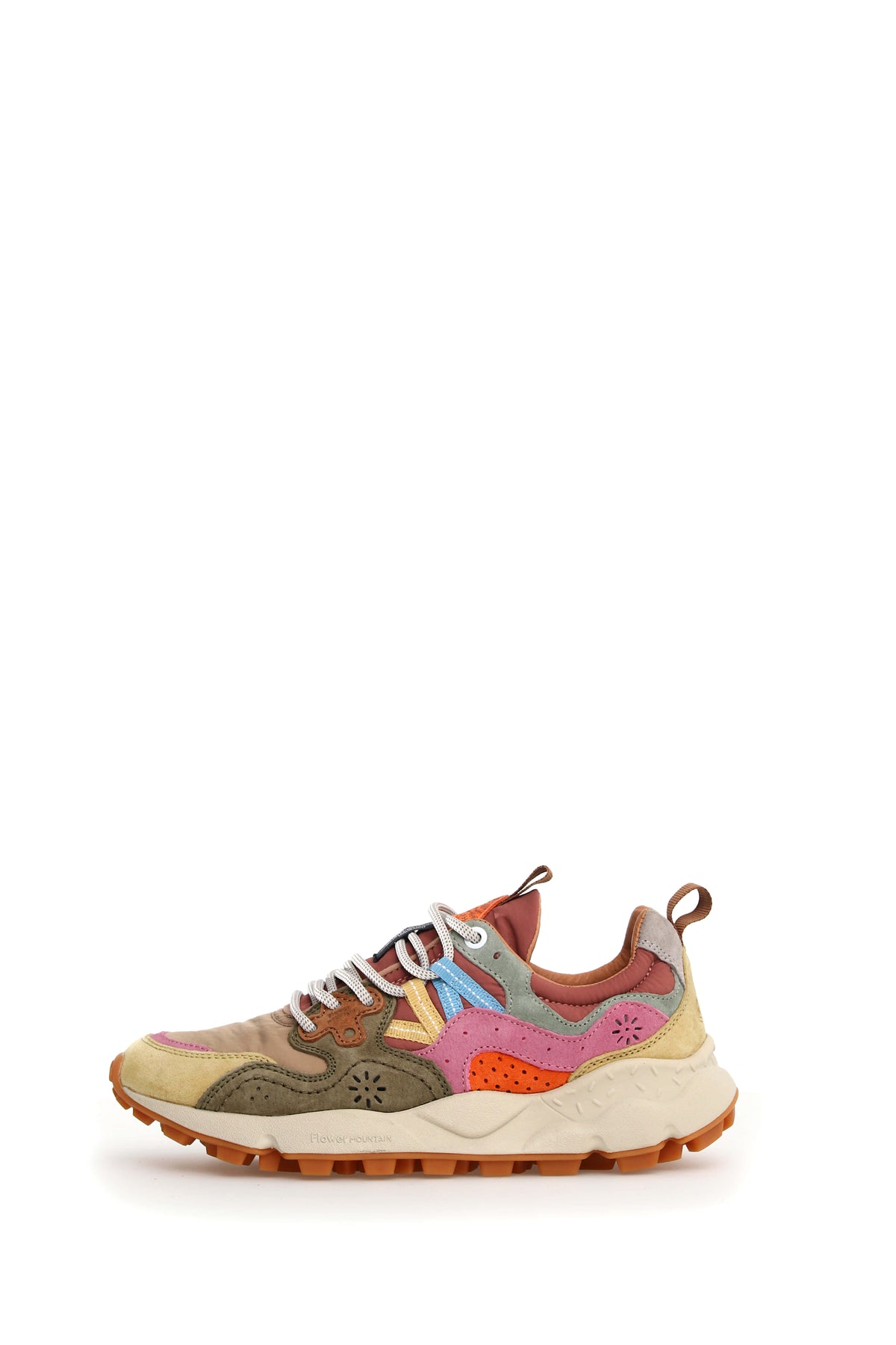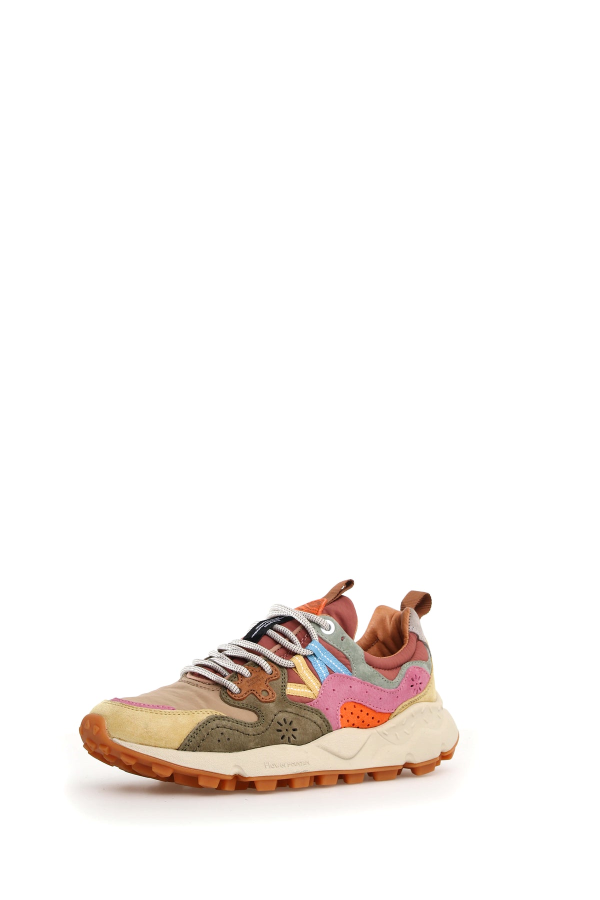 Sneaker in tessuto tecnico con inserti in suede multicolor. Occhielli rinforzati e lacci trek. Soletta interna in sughero naturale antibatterico, fondo in gomma ultra leggera con battistrada dentellato.