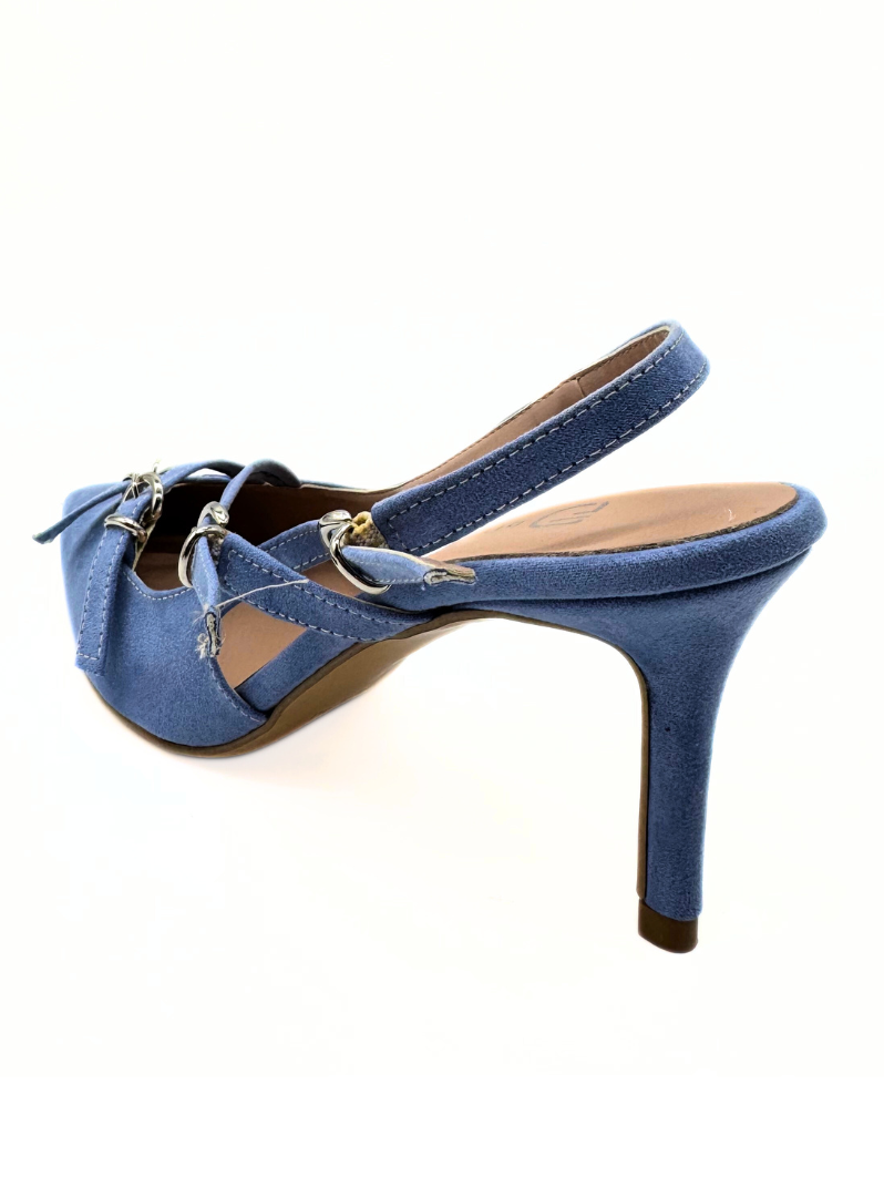 Sandalo in tessuto scamosciato color cielo, modello slingback. Si tratta di una proposta elegante, a punta, con cinturino sul tallone. Le fibbie, tono su tono, posizionate lungo il collo del piede donano personalità ad una calzatura tra le più amate dalle donne di tutti i tempi. Il tacco a spillo completa una calzatura chic ed al tempo stesso confortevole.